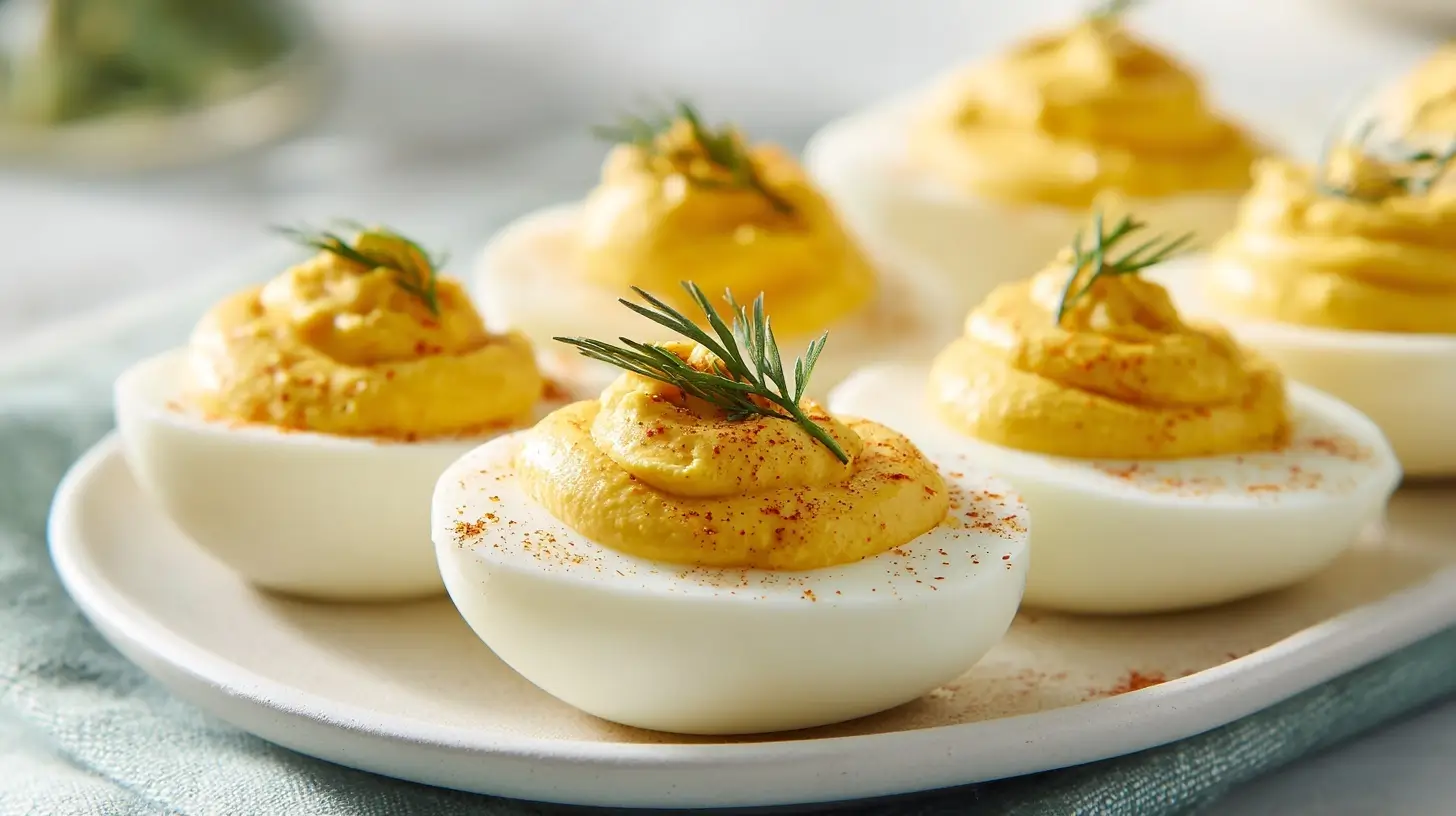 Serviert die deviled eggs auf einem schönen Teller. Es ist der perfekte Snack für gesellige Runden, ganz gleich ob mit Freunden oder der Familie.