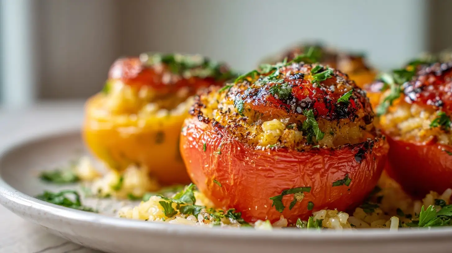 Leckere gefüllte Tomaten im Airfryer, perfekt für ein gesundes Abendessen.